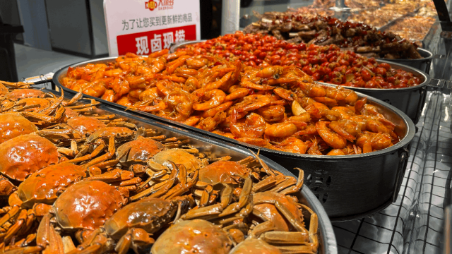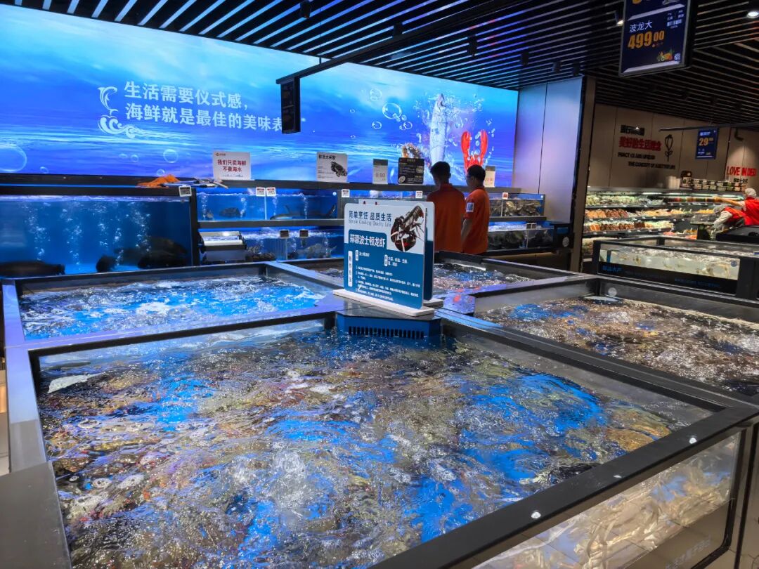 在水产区,商品组合非常丰富,更加注重品质。这里有599元/只的澳龙、499元/只的波龙、299元/斤的帝王蟹、188元/斤的波龙、249元/斤的珍宝蟹、149元/斤的面包蟹等品质之选,也有鳜鱼、鲈鱼、多宝鱼、生蚝、基围虾等极致性价比之选。