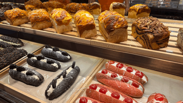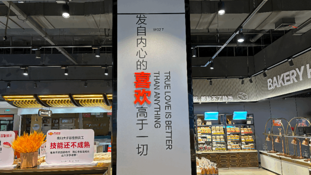 烘焙方面,从原材料保障品质,采用进口动物奶油,不使用代可可脂、氢化植物油、人造奶油、植物奶油和起酥油,坚决杜绝使用脱氢乙酸钠等防腐剂,现烤类商品坚持日清,不售隔夜,让商品更安全更健康。各种网红爆品齐全,如虎皮榴莲千层、椰蓉餐包、慕斯蛋糕以及欧包、牛角包等等。此外,门店还为顾客免费提供面包分切和加热服务。