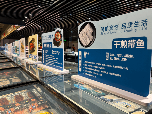 在顾客服务方面,门店的服务细节亦尽显匠心。水产品现捞沥水,包装袋除皮;设有防冻、防扎手套,连卷袋湿手器;收银台为顾客提供一次性用品(筷子、勺子、叉子、吸管等)。店内还有商品介绍、挑选技巧、烹饪菜单等一系列的主题卡片和温馨提示,为顾客提供极大便利。